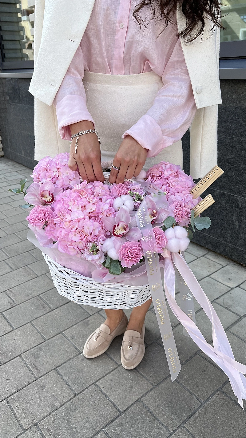 Эта изысканная корзина — символ благодарности и признания. В её составе нежные розовые гортензии и элегантные розовые орхидеи создают атмосферу тепла и уважения. Мягкий хлопок добавляет уюта, а свежий эвкалипт наполняет пространство свежестью и бодростью. Аккуратная маттиола завершает композицию, придавая ей легкую нотку романтики и искренних чувств. Такой подарок станет прекрасным выражением благодарности учителю за его труд и заботу. Стоимость товара актуальна на момент публикации,актуальную стоимость уточняйте у менеджера✨